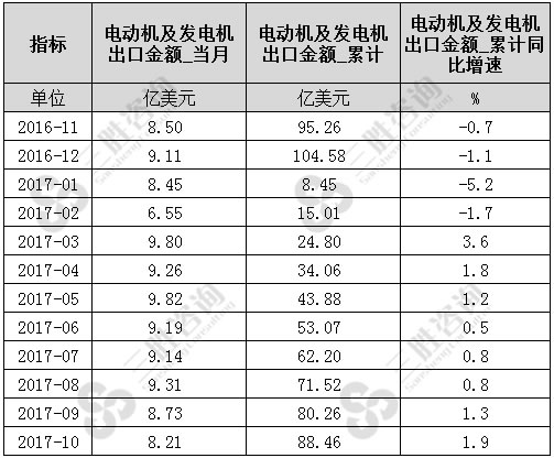 2017年10月中国电动机及发电机出口金额为8.21亿美元,2017年1-10月中国电动机及发电机出口金额累计为88.46亿美元,累计同比增速1.9%。