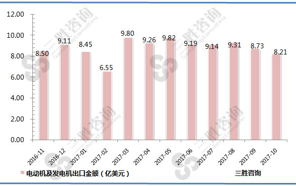 2017年10月中国电动机及发电机出口金额为8.21亿美元