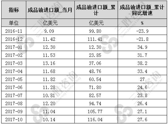 2017年10月中国成品油进口额为10.14亿美元,2017年1-10月中国成品油进口额累计为116.04亿美元,累计同比增速27.6%。