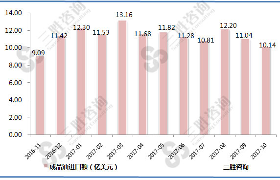 根据三胜产业研究中心数据,2017年1-10月中国成品油进口额统计显示: