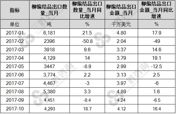 图表:2017年10月中国柳编结品出口数据统计(表)