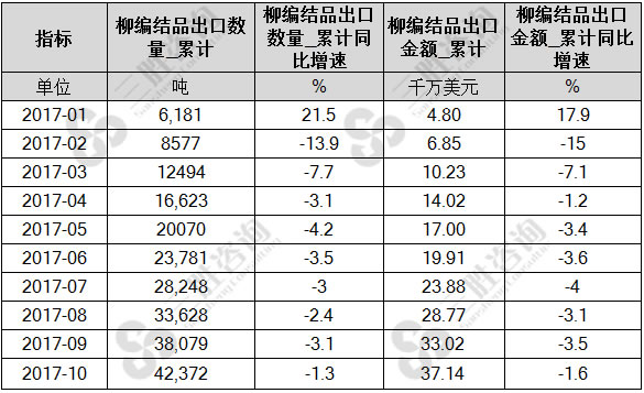 2017年1-10月中国柳编结品出口量累计为42,372吨,累计同比下降1.3%;2017年1-10月中国柳编结品出口金额累计为37.14千万美元,累计同比下降1.6%。