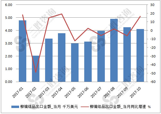 2017年10月中国柳编结品出口量为4,293吨,当月同比增速18.7%;2017年10月中国柳编结品出口金额为4.12千万美元,当月同比增速16.4%,