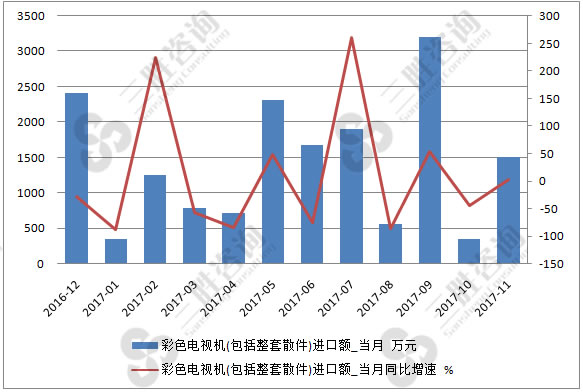 图表:2016-2017年11月中国彩色电视机(包括整套散件)进口额统计(图)