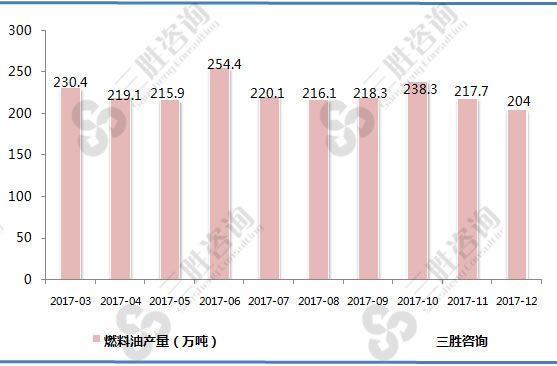 根据三胜产业研究中心数据,2017年1-12月全国燃料油产量统计显示: