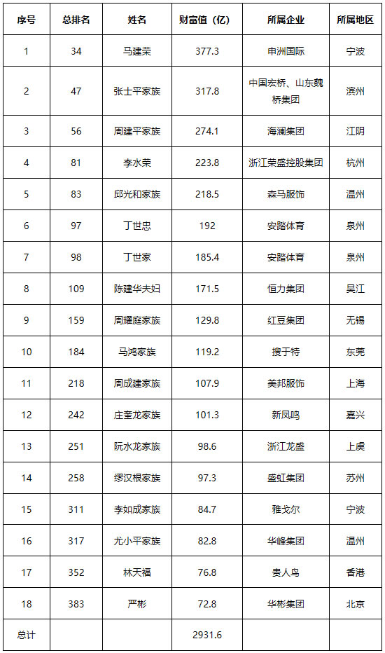 过去较少在财富榜上露面的申洲国际马建荣,以377.3亿元排名第34位,在上榜纺织富豪榜中排名第一位,新晋纺织首富。