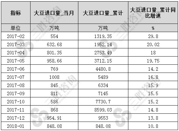 2018年1月中国大豆进口量为848.08万吨,同比增速10.8%,2017年中国大豆进口量累计为9553万吨。
