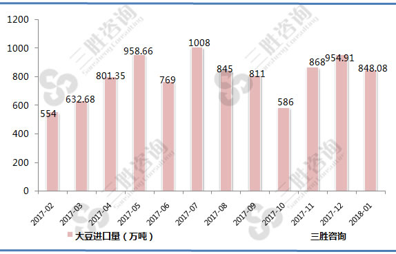 根据三胜产业研究中心数据,2017-2018年1月中国大豆进口量统计显示:
