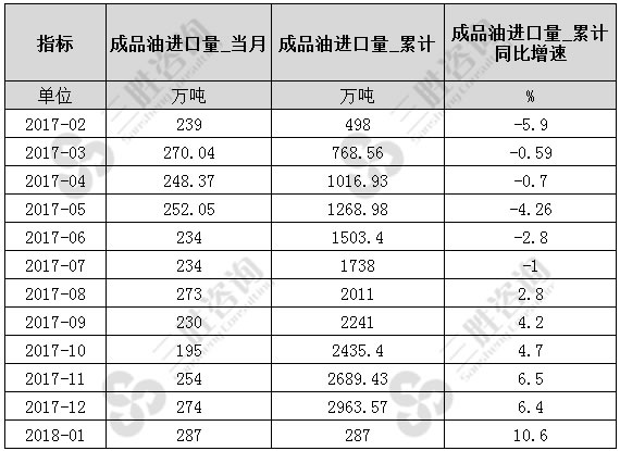 2018年1月中国成品油进口量为287万吨,同比增速10.6%,2017年中国成品油进口量累计为2963.57万吨。