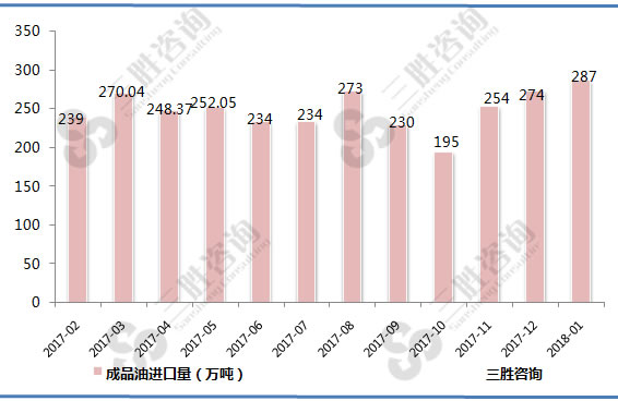 根据三胜产业研究中心数据,2017-2018年1月中国成品油进口量统计显示: