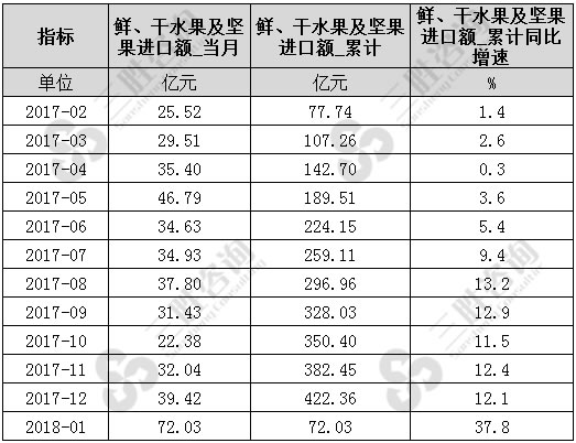 2018年1月中国鲜、干水果及坚果进口额为72.03亿元,同比增速37.8%,2017年中国鲜、干水果及坚果进口额累计为422.36亿元。