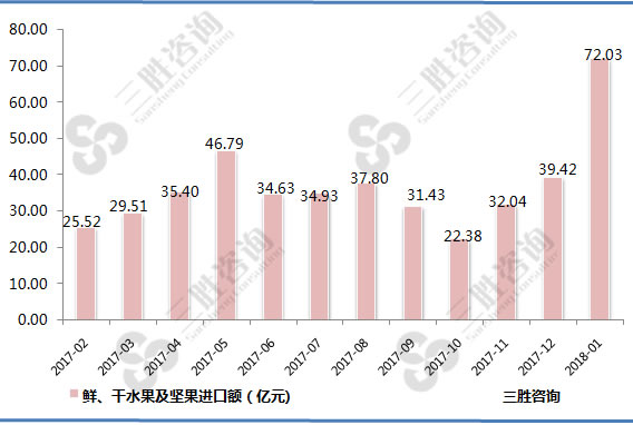 根据三胜产业研究中心数据,2017-2018年1月中国鲜、干水果及坚果进口额统计显示: