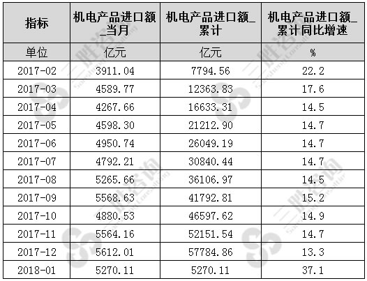 2018年1月中国机电产品进口额为5270.11亿元,同比增速37.1%,2017年中国机电产品进口额累计为57784.86亿元。