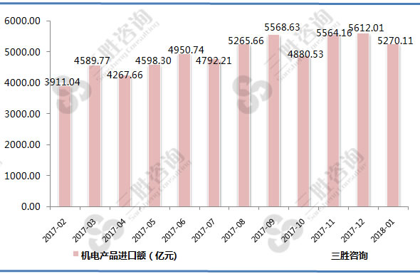 根据三胜产业研究中心数据,2017-2018年1月中国机电产品进口额统计显示: