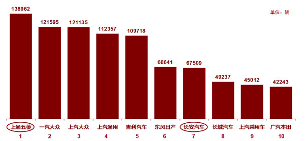 从广义乘用车国内销售综合数来看,前三名分别是上汽通用五菱、一汽-大众、上汽大众。