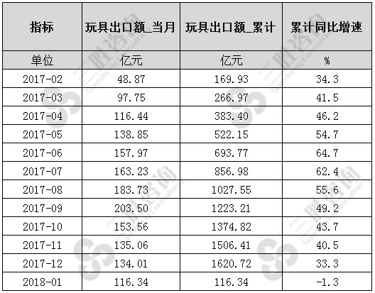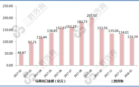根据三胜产业研究中心数据,2017-2018年1月中国玩具出口额统计显示: