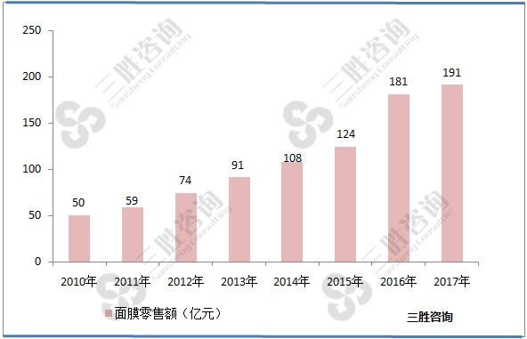 在我国,相对其他护肤品,面膜的销量规模增长最快的,根据中国产业信息研究网发布的《2018-2023年中国面膜行业市场深度分析及投资策略研究报告》数据显示,2017年,中国面膜市场零售总额为191亿元,同比增长超5%,面膜类产品已占到护肤品市场份额的10.0%。国内面膜企业品牌已超6000家,面膜占护肤品市场份额的逐年增长,足以证明面膜已成为护肤品市场中越来越占据主动地位的品类,中国面膜市场相对已经进入成熟阶段。