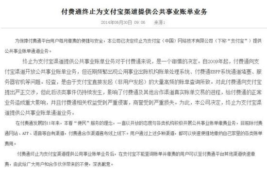 6月30日早间,上海生活费用的在线查询及支付服务平台付费通今日发公告称,为保障付费通平台用户每月缴费的便捷与安全,公司将终止为支付宝公司提供公共事业账单通道业务。