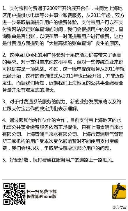 对此,支付宝回应称,支付宝与多家机构合作,付费通其中的一个渠道之一,并且占很小体量,此次付费通终止服务,用户还可以通过其他渠道用支付宝缴费。以下图片为支付宝在其官方微博发表的回应声明: