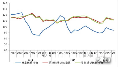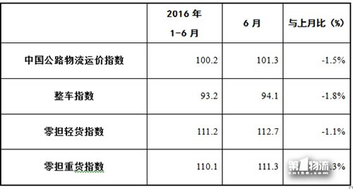 从分车型指数看,6月整车指数为94.1点,比上月回落1.8%,但比上年同期增长5.7%;零担轻货指数为112.7点,比上月回落1.1%,比上年同期下降1.5%;零担重货指数为111.3点,比上月回落1.3%,比上年同期下降3.4%。