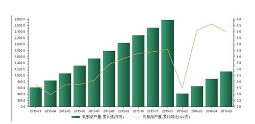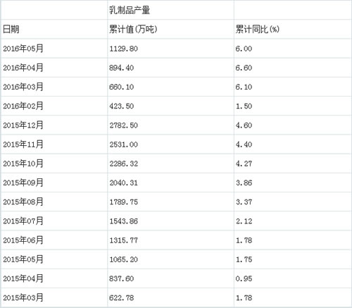 以下为2015年3月至2016年5月乳制品累计产量统计:
