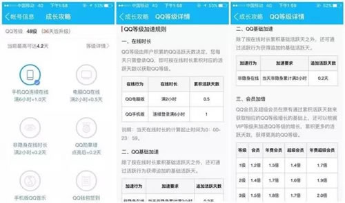 在用户成长体系中做的最出色的应该就是QQ了,腾讯有一套完整的用户成长体系。早期这一体系比较简单,就是按日登录时长、登录天数积累等级,更有星星、月亮和太阳图标来显示等级。很多人对此非常熟悉,这一体系曾对QQ的高日活起到至关重要的作用。随着QQ的发展,更多商业化元素的加入,这一体系也在不断发展和完善。