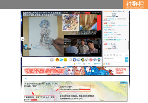 这里该视频作者开设了直播栏,然后在视频右上方滚屏、视频介绍中插入社群群号。那么对画画,尤其是此类二次元画的网友,肯定会有极大的兴趣加入社群。