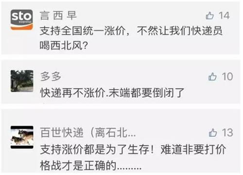 虽然广东省发改委开出的罚单有理有据。但每日经济新闻记者注意到,网上针对该罚款事件的评论中,不少基层快递员依然叫苦喋喋,反映因为价格战侵蚀利润带来的生存压力,以及不断上涨的房租、人工、伙食成本。甚至有支持全国统一涨价的呼声,支持涨价也基本都是为了生存: