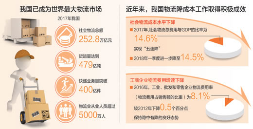 2017年,我国社会物流总额252.8万亿元;货运量达到479亿吨,公路、铁路货运量、港口货物吞吐量多年来居世界第一;快递业务量突破400亿件……实体经济的快速发展催生了日益旺盛的物流需求,作为全球第二大经济体的中国已成为世界最大的物流市场。与此同时,物流业也在国民经济中发挥着越来越重要的作用,截至去年年底,物流相关法人单位数约37万家,物流业从业人员超过5000万人,成为吸纳就业的重要行业之一。